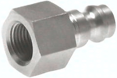 Werkstoffe: Gehäuse: Messing, Messing vernickelt, Stahl gehärtet oder 1.4305, Dichtung: NBR (Edelstahl: Viton) Temperaturbereich: -20°C bis max. +100°C (Edelstahl: -15°C bis max. +200°C) Betriebsdruck: 0 - 35 bar sowie Grobvakuum Durchfluss*: 560 l/min (Option -BA: 360 l/min) *6 bar Eingangsdruck, 0,5 bar Druckdifferenz Achtung: Nur folgende Paarungen von Kupplungsdose und Kupplungsstecker sind möglich: Kupplungsdose absperrend BA mit Kupplungsstecker ohne Ventil Kupplungsdose absperrend BA mit Kupplungsstecker absperrend BA Kompatibel zu**: Rectus (21, 90), Camozzi, EWO, KANI **Namen und Bezeichnungen sind z.T. eingetragene Warenzeichen der jeweiligen Hersteller. Hinweis: Unverwechselbare Stecker passen auch in uncodierte Kupplungsdosen Optional: Körper aus 1.4404 -ES4A, mit Ventil für beidseitige Absperrung -BA, NPT-Gewinde -NPT, rote Farbmarkierung -RO, grüne Farbmarkierung -GR, blaue Farbmarkierung -BL, schwarze Farbmarkierung -SCH, rote Farbmarkierung, unverwechselbar Achteck SW10 -ROC, grüne Farbmarkierung, unverwechselbar Kreis Ø 10,5 mm -GRC, blaue Farbmarkierung, unverwechselbar Sechseck SW10 -BLC, braune Farbmarkierung, unverwechselbar Dreieck 9,5 mm -BRC