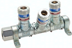 Beschreibung: Druckluftverteilsystem komplett montiert mit einzeln schwenkbaren Standardkupplungen NW 7,2. Im Lieferumfang ist ein optional montierbarer Gewindeausgang (G 1/2") zur Verkettung mehrerer Blöcke enthalten. Werkstoffe: Körper: Stahl verzinkt, Zink, Dichtung: NBR Temperaturbereich: -20°C bis max. +100°C (Sicherheitskupplung max. +80°C) Betriebsdruck: 0 bis 16 bar Medien: Druckluft