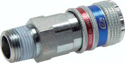 Werkstoffe: Gehäuse: Stahl / Messing verzinkt, Dichtung: NBR Temperaturbereich: -20°C bis max. +80°C Betriebsdruck: 0 bis 16 bar Durchfluss: 2.250 l/min (Eingangsdruck 6 bar, max. Druckabfall 0,5 bar) Funktion: Das Kuppeln erfolgt wie bei Standardkupplungen durch Einstecken des Stecknippels in die Kupplungsdose. Das Entkuppeln erfolgt durch Zurückschieben der Entriegelungshülse. Dann schließt die Kupplungsdose und entlüftet den Kupplungsstecker, während dieser noch in der Kupplungsdose festgehalten wird. Die Kupplungsdose gibt den Stecker erst frei, wenn der Restdruck auf der Steckerseite einen Druck von ca. 0,3 bar unterschritten hat. Der gefährliche Peitschenhiebeffekt wird somit zuverlässig (abhängig von dem auf Steckerseite anliegendem Druck) verhindert. Achtung: Nur Kupplungsstecker aus gehärtetem Stahl verwenden! Kompatibel zu**: Rectus (25, 26, 1600, 1625), TEMA (1600), CEJN (320), JWL (520, 530, 560), Legris (25, 26), Parker (PE, PEF), Prevost (E ... 07) und viele andere deutsche Fabrikate **Namen und Bezeichnungen sind z.T. eingetragene Warenzeichen der jeweiligen Hersteller.