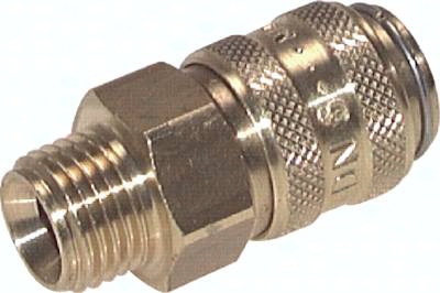 Werkstoffe: Anschluss, Ventil, Ventilkörper und Entriegelungshülse: Messing oder 1.4305, Feder, Sprengring und Verriegelungskugeln: Edelstahl, Dichtungen: Viton (PTFE-beschichtet) Temperaturbereich: -20°C bis max. +160°C Betriebsdruck: 0 - 15 bar Einsatzbereich: für flüssige Medien mit Temperaturen bis +160°C, z.B. für Kühlkreisläufe an Kunststoffmaschinen (+200°C auf Anfrage) Optional: mit Entriegelungssicherung (ist bei Edelstahlkupplung Standard) -S Zur leichteren Unterscheidung der Messingkupplungen: Kupplungsdose: Schiebehülse aus Messing blank = absperrend, Schiebehülse aus Messing vernickelt = ohne Ventil Kupplungsstecker: Stecker aus Messing blank = metrisches Gewinde, Stecker aus Messing vernickelt = zölliges Gewinde Nur folgende Paarungen von Kupplungsdose und Kupplungsstecker sind möglich: Kupplungsdose ohne Ventil OV mit Kupplungsstecker ohne Ventil, Kupplungsdose mit Ventil BA mit Kupplungsstecker mit und ohne Ventil Kompatibel zu**: Hasco (Z8 .../9 ...) **Namen und Bezeichnungen sind z.T. eingetragene Warenzeichen der jeweiligen Hersteller. *Bauform wie Z82/9/R1/4, **mit Entriegelungssicherung