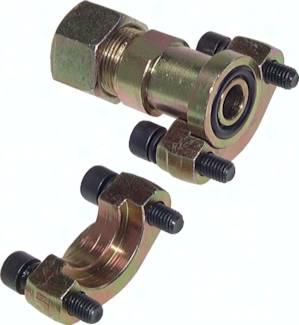 Werkstoffe: Automatenstahl 1.0718, galv. verzinkt, gelb chromatiert Lieferumfang: Flansch mit Halbschalen, Überwurfmutter, Schneidring, O-Ring und metrischem Schraubensatz Optional: Edelstahl 1.4571 -ES
