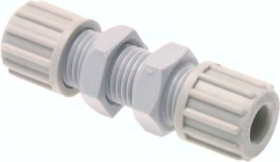 Werkstoffe: PA (Polyamid), PP (Polypropylen), PVDF (Polyvinylidenfluorid), PFA (PTFE) Einsatzgebiet und allgemeine chemische Resistenzen PA: Einsatz in der Pneumatik sowie für Wasser. Die chemische Beständigkeit ist gut gegenüber Benzin, Diesel, Heizöl, Alkalien. PP: Widerstandsfähig gegen wässrige Lösungen von Säuren, Laugen und Salzen, sowie einer großen Zahl organischer Lösungsmittel. Ungeeignet für konzentrierte oxydierende Säuren. PVDF: Widerstandsfähig gegen Säuren, Salzlösungen, aliphatische, aromatische und chlorierte Kohlenwasserstoffe, Alkohole und Halogene. Bedingt verwendbar für Ketone, Ester, Äther, organische Basen und Alkalilaugen. PFA: Widerstandsfähig gegen fast alle Chemikalien. Betriebstemperatur: PA: bis max. +80°C, PP: bis max. +90°C, PVDF: -40°C bis max. +140°C, PFA: bis max. +250°C PN (bei +20°C): 10 bar Anschlussprinzip "1" für Schläuche (nicht für PTFE-Schläuche): PA, PP, PVDF: Der Schlauch wird über die feste Schlauchtülle in die Verschraubung geschoben und mit einem elastischen Klemmring durch Anziehen der Rändelmutter arretiert. Der elastische Klemmring ermöglicht es, innerhalb der gleichen Verschraubung mehrmals verwendet zu werden. Das bedeutet, die Verschraubung kann gelöst werden und mit dem gleichen Klemmring wieder dicht geschlossen werden. Alle Gewinde und Schlauchtüllen (für Schlauchaufnahme) sind nahtfrei. Anschlussprinzip "2" für Schläuche (auch für PTFE-Schläuche): PFA: Der Schlauch wird über die feste Schlauchtülle in die Verschraubung geschoben und mit einer Schneid-Dichtring-Kombination durch Anziehen der Rändelmutter arretiert. Alle Gewinde und Schlauchtüllen (für Schlauchaufnahme) sind nahtfrei. *Bei PFA- und PTFE-Schläuchen empfehlen wir einen Austausch des Klemmrings gegen eine Schneid- und Dichtringkombination (KL..PP), **Rändelmutter und Klemmring in PP, ***Grundmaterial FDA-zugelassen