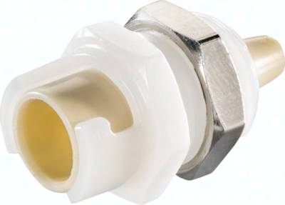Steckerdurchmesser: 6,1 mm Durchfluss* Luft (Wasser): 40 - 200 l/min (0,3 - 2,6 l/min) Betriebsdruck: 0 - 7 bar, Vakuum bis 80% Funktion: Wird durch Verdrehen des Steckers und der Muffe bis zum hörbaren "Klick" gekuppelt. Es können Kupplungsstecker und Kupplungsdosen mit und ohne Absperrventil sowie verschiedene Werkstoffe beliebig kombiniert werden. Das Absperrventil verhindert ein Austreten des Mediums im ungekuppelten Zustand. Idealer Ersatz für "Luer"-Verbindungen in der Medizintechnik. Im gekuppelten Zustand sind die Schlauchtüllen innerhalb der Bajonettverschlüsse frei drehbar und verhindern so ein Abknicken oder Verdrehen des Schlauches. Typ POM: Werkstoffe: Körper und Ventile: Acetal (POM, FDA-zertifiziert), Ventilfedern; Edelstahl AISI 316, Dichtungen: NBR, Bajonettverschluss: Acetal (POM, FDA-zertifiziert), Schottmutter: Messing vernickelt Temperaturbereich: -40°C bis max. +80°C Medien: Druckluft, Wasser, Alkohole, Glykol, Mineralöle, Benzin, Sauerstoff**, Kohlendioxid, milde Chemikalien Sterilisierbar durch: Formalin, Isopropylalkohol, Ethylalkohol Einsatzbereich: Für allgemeine Anwendungen. Gute Beständigkeit gegenüber Mineralölen. Typ Polypropylen: Werkstoffe: Körper und Ventile: Polypropylen (FDA-zertifiziert), Ventilfedern: Edelstahl AISI 316, Dichtungen: EPDM, Bajonettverschluss: Acetal (POM, FDA-zertifiziert), Schottmutter: Messing vernickelt Temperaturbereich: 0°C bis max. +80°C Medien: Druckluft, Wasser, viele Säuren und Laugen, Alkohole, Glykol, MEK, Sauerstoff**, Ozon, Kohlendioxid, viele Chemikalien Sterilisierbar durch: Formalin, Isopropylalkohol, Ethylalkohol, Ethylenoxid, Gammastrahlung Einsatzbereich: Für viele Chemikalien geeignet. Keine Beständigkeit gegenüber Mineralölen. *bei 1 bar Druckabfall (je nach Konfiguration der Kupplungskombination: mit/ohne Ventil, Anschlussdimension, ... liegt der Durchfluss innerhalb des angegebenen Bereichs), **vor Verwendung mit Sauerstoff unbedingt reinigen. Kompatibel zu***: CPC-Colder SMC ***Namen und Bezeichnungen sind z.T. eingetragene Warenzeichen der jeweiligen Hersteller. Schottgewinde: 7/16"-24 UNF (Ø 11,2 mm), max. Blechdicke: 5,3 mm Hinweis: Schlauch kann aus Platzgründen nicht mit Schelle befestigt werden, sondern wird nur auf die Tülle aufgesteckt.