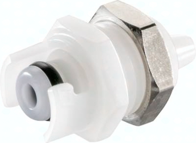 Steckerdurchmesser: 6,1 mm Durchfluss* Luft (Wasser): 40 - 200 l/min (0,3 - 2,6 l/min) Betriebsdruck: 0 - 7 bar, Vakuum bis 80% Funktion: Wird durch Verdrehen des Steckers und der Muffe bis zum hörbaren "Klick" gekuppelt. Es können Kupplungsstecker und Kupplungsdosen mit und ohne Absperrventil sowie verschiedene Werkstoffe beliebig kombiniert werden. Das Absperrventil verhindert ein Austreten des Mediums im ungekuppelten Zustand. Idealer Ersatz für "Luer"-Verbindungen in der Medizintechnik. Im gekuppelten Zustand sind die Schlauchtüllen innerhalb der Bajonettverschlüsse frei drehbar und verhindern so ein Abknicken oder Verdrehen des Schlauches. Typ POM: Werkstoffe: Körper und Ventile: Acetal (POM, FDA-zertifiziert), Ventilfedern; Edelstahl AISI 316, Dichtungen: NBR, Bajonettverschluss: Acetal (POM, FDA-zertifiziert), Schottmutter: Messing vernickelt Temperaturbereich: -40°C bis max. +80°C Medien: Druckluft, Wasser, Alkohole, Glykol, Mineralöle, Benzin, Sauerstoff**, Kohlendioxid, milde Chemikalien Sterilisierbar durch: Formalin, Isopropylalkohol, Ethylalkohol Einsatzbereich: Für allgemeine Anwendungen. Gute Beständigkeit gegenüber Mineralölen. Typ Polypropylen: Werkstoffe: Körper und Ventile: Polypropylen (FDA-zertifiziert), Ventilfedern: Edelstahl AISI 316, Dichtungen: EPDM, Bajonettverschluss: Acetal (POM, FDA-zertifiziert), Schottmutter: Messing vernickelt Temperaturbereich: 0°C bis max. +80°C Medien: Druckluft, Wasser, viele Säuren und Laugen, Alkohole, Glykol, MEK, Sauerstoff**, Ozon, Kohlendioxid, viele Chemikalien Sterilisierbar durch: Formalin, Isopropylalkohol, Ethylalkohol, Ethylenoxid, Gammastrahlung Einsatzbereich: Für viele Chemikalien geeignet. Keine Beständigkeit gegenüber Mineralölen. *bei 1 bar Druckabfall (je nach Konfiguration der Kupplungskombination: mit/ohne Ventil, Anschlussdimension, ... liegt der Durchfluss innerhalb des angegebenen Bereichs), **vor Verwendung mit Sauerstoff unbedingt reinigen. Kompatibel zu***: CPC-Colder SMC ***Namen und Bezeichnungen sind z.T. eingetragene Warenzeichen der jeweiligen Hersteller. Schottgewinde: 7/16"-24 UNF (Ø 11,2 mm), max. Blechdicke: 5,3 mm Hinweis: Schlauch kann aus Platzgründen nicht mit Schelle befestigt werden, sondern wird nur auf die Tülle aufgesteckt.