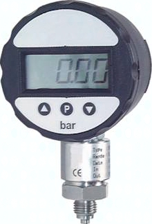 Verwendung: Überall dort, wo eine hohe Messgenauigkeit zusammen mit hoher Überdrucksicherheit und Robustheit benötigt wird. Zum Beispiel zur Kalibrierung von Manometern** (unter Verwendung der Handpumpe HP 40). Werkstoffe: Gehäuse: Kunststoff, Anschluss: 1.4571, Dichtung: NBR: (>= 1000 bar: 1.4571), Sensor: Keramik (>= 1000 bar: 1.4571) Anschlussgewinde: G 1/4"*** (>= 1000 bar: G 1/2"***) Temperaturbereich: Umgebung: 0°C bis max. +60°C, Medium: -30°C bis max. +85°C Zulässiger Überdruck: bis 40 bar: 3 x, bis 160 bar: 2 x, ab 250 bar: 1,5 x Skalenendwert* Klasse: 0.5 Wandlungsrate: 5 Messungen / Sekunde Automatische Abschaltzeit: 8 min. Hilfsenergie: 9V Blockbatterie, Standzeit: 5.000 h (9V Batterie 600 mA) bzw. 10.000 h (9V Lithium Batterie 1.200 mA) Schutzart: IP 65 Anzeige: 4-stelliges LCD-Display, Ziffernhöhe 12,7 mm Optional: Dauerbetrieb -D, abweichende Abschaltzeiten -4, -16, -32, -64, Dauerbetrieb mit externer 24 V DC-Versorgung (M 12-Stecker, 4-adrig) -D24, Dauerbetrieb mit externer 24 V DC-Versorgung und Schaltausgang (30 V AC/DC, max. 2 A, M 12-Stecker, 5-adrig) -D24S *600 bar: 1,3-fach überdruckssicher, **5-Punkte Messprotokoll oder DKD-Zertifikat auf Anfrage, ***mit Zentrierzapfen für Profildichtring
