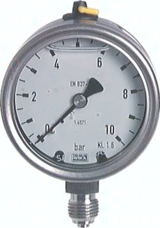 Werkstoffe: Gehäuse: 1.4301, Messsystem und Anschluss: 1.4404, Sichtscheibe: Mehrschichten-Sicherheitsglas Anschlussgewinde: G 1/4"* Klasse: 1.6 Temperaturbereich: Umgebung: -20°C bis max. +60°C, Messstoff: max. +100°C Schutzart: IP 65 *mit Zentrierzapfen für Profildichtring