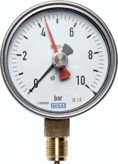 Werkstoffe: Gehäuse: 1.4301, Messsystem: Cu-Legierung (1.4404 bei Drücken >= 100 bar), Anschluss: Messing, Sichtscheibe: Instrumentenflachglas Anschlussgewinde: G 1/2"* Klasse: 1,0 Temperaturbereich: Umgebung: -40°C bis max. +60°C, Messstoff: max. +80°C Schutzart: IP 54 Optional: mit rückstellbarem Schleppzeiger -SZ *mit Zentrierzapfen für Profildichtring