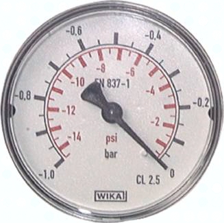 Werkstoffe: Gehäuse: Kunststoff schwarz, Messsystem und Anschluss: Messing, Sichtscheibe: Kunststoff glasklar Anschlussgewinde: G 1/4"* Klasse: 2,5 Temperaturbereich: Umgebung: -40°C bis max. +60°C, Messstoff: max. +60°C Zifferblatt: 1. Skala außen (schwarz), Anzeige in bar, 2. Skala innen (rot), Anzeige in PSI Durchmesser: 63 mm *mit Zentrierzapfen für Profildichtring, **Optional: Gehäuse aus Stahlblech, Klasse 1.6 -ST