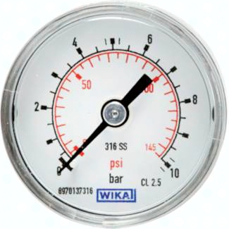Werkstoffe: Gehäuse: 1.4301, Messsystem und Anschluss: 1.4571, Sichtscheibe: Polycarbonat Anschlussgewinde: G 1/8" oder G 1/4"*, rückseitig zentrisch Klasse: 2.5 Temperaturbereich: Umgebung: -40°C bis max. +60°C, Messstoff: max. +100°C Zifferblatt: 1. Skala außen (schwarz), Anzeige in bar, 2. Skala innen (rot), Anzeige in PSI Schutzart: IP 54 *mit Zentrierzapfen für Profildichtring