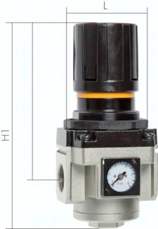 Ausführung: rücksteuerbar (mit Sekundärentlüftung) Werkstoffe: Körper: Aluminium, Federhaube: Polyamid, Membrane und Dichtungen: NBR Temperaturbereich: bis max. +60°C Eingangsdruck: 1,5 - 10 bar (Regelbereich: 0,5 - 8,5 bar) Medien: Druckluft Vorteile: automatische Entlüftung bei Überdruck auf der Sekundärseite, einfacher Zusammenbau von Einzelkomponenten einer Baureihe durch Koppelpakete, Handrad kann durch Herunterdrücken arretiert werden, Befestigungswinkel im Lieferumfang enthalten, platzsparendes Kompaktmanometer bereits montiert