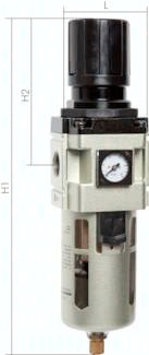 Ausführung: Druckregler, rücksteuerbar (mit Sekundärentlüftung) und zusätzlicher Filterung durch Zentrifugalprinzip und Sinterfilter Werkstoffe: Körper: Aluminium, Federhaube: Polyamid, Membrane und Dichtungen: NBR, Behälter: Polycarbonat Temperaturbereich: bis max. +60°C Eingangsdruck: 1,5 - 10 bar (Regelbereich: 0,5 - 8,5 bar) Porenweite im Filter: 5 µm Medien: Druckluft Vorteile: automatische Entlüftung bei Überdruck auf der Sekundärseite, einfacher Zusammenbau von Einzelkomponenten einer Baureihe durch Koppelpakete, Handrad kann durch Herunterdrücken arretiert werden, Befestigungswinkel im Lieferumfang enthalten, platzsparendes Kompaktmanometer bereits montiert *wird ohne Schutzkorb geliefert, **sobald der Eingangsdruck unter den min. Eingangsdruck fällt, öffnet das Ablassventil