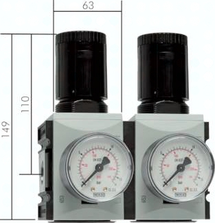 Ausführung: rücksteuerbar (mit Sekundärentlüftung) Werkstoffe: Körper: Grivory® (PA 66), Federhaube: POM, Membrane und Dichtungen: NBR Temperaturbereich: -10°C bis max. +50°C Eingangsdruck: max. 16 bar (Baureihe 0: max. 12 bar) Manometeranschluss: G 1/4" Medien: geölte und ungeölte Druckluft, neutrale Gase Vorteile: automatische Entlüftung bei Überdruck auf der Sekundärseite, einfacher Zusammenbau von Einzelkomponenten durch Koppelpakete innerhalb einer Baureihe, Handrad kann durch Herunterdrücken arretiert und mit Schloss verriegelt werden - bitte verwenden Sie VHS 20. Baureihe 0 kann nicht verschlossen werden. Schalttafelgewinde: M 42 x 1,5 Lieferumfang: Druckregler einschließlich 50 mm Manometer Durchfluss: G 3/8": 4300 l/min, G 1/2": 5000 l/min, Sekundärentlüftung: 70 l/min (Präzisionsdruckregler 120 l/min) Vorteile: Durch Verblockung mehrerer Regler können über eine Druckversorgung mehrere Druckluftkreise mit unabhängig regelbaren Drücken versorgt werden. Der Druckluftabgang (G 3/8") ist gegenüber dem Manometer angeordnet. *Standardbaureihe, bitte bevorzugt einsetzen, da Regelbereich universal einsetzbar, **geringer Eigenluftverbrauch (2,6 l/min bei 6 bar Ausgangsdruck) dafür aber bessere Hysterese - nahezu unabhängig von Primärdruck, Regelgenauigkeit: ± 25 mbar