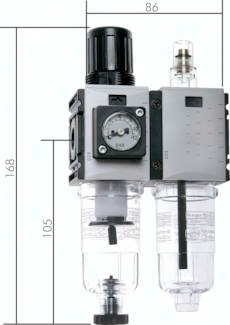 Ausführung: Filterregler rücksteuerbar, mit angebautem Öler Werkstoffe: Körper: Grivory®, Federhaube: POM, Membrane und Dichtungen: NBR, Behälter: Polycarbonat Temperaturbereich: bis max. +50°C Eingangsdruck: 1,5 - 16 bar (Baureihe 0: 1,5 - 12 bar) Kondensatentleerung: halbautomatisch** Manometeranschluss: G 1/4" Porenweite im Filter: 5 µm Medien: Druckluft, neutrale Gase Vorteile: automatische Entlüftung bei Überdruck auf der Sekundärseite, einfacher Zusammenbau von Einzelkomponenten durch Koppelpakete innerhalb einer Baureihe, Handrad kann durch Herunterdrücken arretiert und mit Schloss verriegelt werden - bitte verwenden Sie VHS 20, halbautomatische Ölbefüllung durch Anschließen eines Schlauches unten an den Ölbehälter (G 1/8"). Durch diesen Schlauch wird bei Drücken des Öleinfüllknopfes das Öl in den Behälter gesaugt (nicht Baureihe 0). max. Kondensatmenge: 16 cm³ Schalttafelgewinde: M 30 x 1,5 Lieferumfang: Wartungseinheit einschließlich Manometer Öldosierung bei 1000 l/min: ca. 10 - 20 Tropfen/min Ölvorrat: 35 cm³ Öleransprechgrenze ( bei 6 bar): 26 l/min Optional: Ausführung mit Metallbehälter -M, Ablassautomatik -AM, Ablassautomatik drucklos geschlossen (Eingangsdruck 0 - 12 bar) -AMNC *Standardbaureihe, bitte bevorzugt einsetzen, da Regelbereich universal einsetzbar, **Sobald der Eingangsdruck unter den min. Eingangsdruck fällt, öffnet das Ablassventil automatisch. Durch Festdrehen der Ablassschraube kann die halbautomatische Ablassventilöffnung verhindert werden., ***Montage eines Standardmanometers nur mit Manometeradapter möglich, Anzeigebereich des Kompaktmanometers: 0 - 12 bar, bzw. 0 - 6 bar