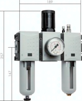 Ausführung: Filter, Druckregler rücksteuerbar, mit angebautem Öler Werkstoffe: Körper: Grivory®, Federhaube: POM, Membrane und Dichtungen: NBR, Behälter: Polycarbonat Temperaturbereich: bis max. +50°C Eingangsdruck: 1,5 - 16 bar (Baureihe 0: 1,5 - 12 bar) Kondensatentleerung: halbautomatisch** Manometeranschluss: G 1/4" Porenweite im Filter: 5 µm Medien: Druckluft, neutrale Gase Vorteile: automatische Entlüftung bei Überdruck auf der Sekundärseite, einfacher Zusammenbau von Einzelkomponenten durch Koppelpakete innerhalb einer Baureihe, Handrad kann durch Herunterdrücken arretiert und mit Schloss verriegelt werden - bitte verwenden Sie VHS 20, halbautomatische Ölbefüllung durch Anschließen eines Schlauches unten an den Ölbehälter (G 1/8"). Durch diesen Schlauch wird bei Drücken des Öleinfüllknopfes das Öl in den Behälter gesaugt (nicht Baureihe 0). max. Kondensatmenge: 49 cm³ Schalttafelgewinde: M 42 x 1,5 Lieferumfang: Wartungseinheit einschließlich 50 mm Manometer Öldosierung bei 1000 l/min: ca. 1 - 2 Tropfen/min Ölvorrat: 80 cm³ Öleransprechgrenze (bei 6 bar): 70 l/min Optional: Ausführung mit Metallbehälter und Sichtrohr -M, Ablassautomatik -AM, Ablassautomatik drucklos geschlossen (Eingangsdruck 0 - 16 bar) -AMNC *Standardbaureihe, bitte bevorzugt einsetzen, da Regelbereich universal einsetzbar, **Sobald der Eingangsdruck unter den min. Eingangsdruck fällt, öffnet das Ablassventil automatisch. Durch Festdrehen der Ablassschraube kann die halbautomatische Ablassventilöffnung verhindert werden.