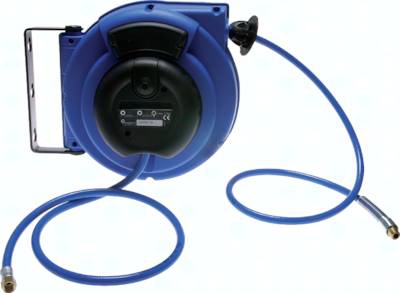 Funktion: Der Schlauch kann ausgezogen und bei jeder Umdrehung der Trommel mehrfach arretiert werden. Nach kurzem Anziehen rollt die Trommel den gesamten Schlauch wieder auf. Werkstoffe: Körper und Trommel: Kunststoff, Befestigungsbügel: Stahl schwarz lackiert, Schlauch: Polyether-Polyurethan (für Wasser: PVC) Lieferumfang: automatischer Schlauchaufroller mit Schlauch, Stopper und Gewindetüllen an den Schlauchenden, Befestigungsbügel *nur für Wasser