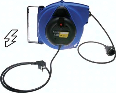 Funktion: Das Kabel kann ausgezogen und bei jeder Umdrehung der Trommel mehrfach arretiert werden. Nach kurzem Anziehen rollt die Trommel das gesamte Kabel wieder auf. Werkstoffe: Körper und Trommel: Kunststoff, Befestigungsbügel: Stahl schwarz lackiert Spannung: max. 230 V Lieferumfang: automatische Kabelaufroller mit Kabel 3 x 1,5 mm² und Schuko-Stecker und Schuko-Kupplung, Typ KAC mit freiem Kabelende am Zugang *nicht Fabrikat CEJN