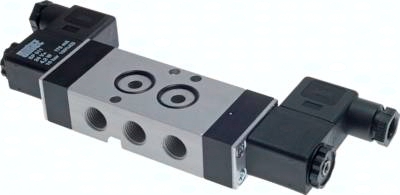Werkstoffe: Körper: Aluminium eloxiert und Kunststoff, Innenteile: Aluminium, Stahl rostfrei und Messing, Dichtung: NBR Temperaturbereich: -10°C bis max. +70°C Betriebsdruck: 3 - 10 bar (Impulsventil: 2 - 10 bar) Steuerspannungen: Standard: 24 V=, 230 V AC, viele Sonderspannungen möglich Leistungsaufnahme: Gleichstrom: 4,2 W, Wechselstrom: 4,0 VA (Anzug: 7,0 VA) Schutzart: IP 65, Steckergröße 1 Wirkungsweise: 3/2-Wege Ausführung entlüftet in den Federraum des Antriebes, daher ist eine Abluftdrosselung nicht möglich. Bei 5/2-Wege Ausführung ist eine Abluftdrosselung (Geschwindigkeitsregulierung) mit Hilfe von 2 Stk. Drosselschalldämpfern DS 14 möglich. Bitte Drosselschalldämpfer gesondert bestellen. *verfügbar mit Atex-Zulassung EX II 2GD c T5 T100°C, T Medium/T amb: -10°C bis max. +50°C, nähere Angaben siehe Bedienungsanleitung, **EX II 2G EEx m IIC T5 / EX II 2D IP 65 T95°C wird mit 3 mtr. Kabel geliefert, ***EX II 2G EEx ia IIC T6 (max. 8 bar) Versorgung aus eigensicheren Stromkreisen U <= 28 V, I <= 115 mA, P <= 1,6 W Information: Diese Ventile werden grundsätzlich mit Spule und Stecker ausgeliefert!