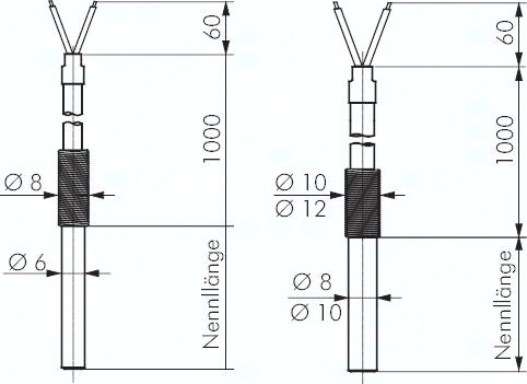 Werkstoffe: Schutzrohr: 1.4571 Temperaturbereich: -10°C bis max. +350°C Messeinsatz: 1 x Pt 100 Anschluss: 1 mtr. Glasseide-Edelstahlgeflecht, Kabelaustritt mit VA-Knickschutzfeder, Leitung nicht feuchtedicht, nur für trockene Umgebung