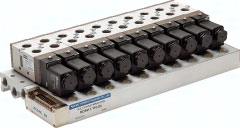 Funktion: Bis zu 22 Stationen lassen sich über ein Multipol-Anschlusskabel ansteuern. Jede Station verfügt über eine LED-Zustandsanzeige und Schutzbeschaltung. Das Terminal kann beliebig mit 5/2- und 5/3-Wegeventilen mit DIN-Stecker der Baureihe SF4000 bestückt werden, wobei monostabile 5/2-Wege Ventile je eine Station, Impuls- und 5/3-Wege Ventile je zwei Stationen belegen.