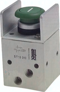 Werkstoffe: Körper: Aluminium eloxiert, Innenteile: Aluminium, Messing und Stahl rostfrei, Dichtung: Kunststoff / NBR Temperaturbereich: -10°C bis max. +70°C Bauart und Funktion: Vorgesteuertes Kolbenschieberventil mit geringer Betätigungskraft. Unbetätigt entweicht im Vorsteuerteil eine geringe Luftmenge von ca. 2,5 l/min, Druckanschluss immer bei 1, Ausgang bei 2, Entlüftung durch eine Bohrung auf der Grundfläche des Ventils, Die Fläche innerhalb der vier Füße des Ventils darf nicht abgedeckt werden, Bei Betätigung schaltet das Ventil auf Durchgang von 1 nach 2. Anwendung: Zum Einschalten von Maschinen und Vorrichtungen aller Art, insbesondere paarweise als Zweihandbetätigung. Durch die kleine Schaltkraft des Servo-Prinzips ist auch im Dauerbetrieb ein ermüdungsfreies Arbeiten gewährleistet. Der Bügel um die Taste schützt vor versehentlicher Betätigung.