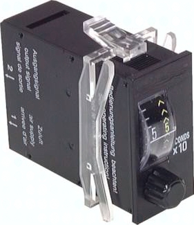 Werkstoffe: Kunststoff Temperaturbereich: 0°C bis max. +60°C Medien: ölfreie Druckluft Funktion: Wird Anschluss 1 mit Druck beaufschlagt, beginnt die eingestellte Zeit zu laufen. Nach Ablauf der eingestellten Zeit wird Eingang 1 auf Ausgang 2 geschaltet. Die Rückstellung erfolgt durch Unterbrechung der Zuluft am Eingang 1. Zeiteinstellung: stufenlos durch Drehknopf