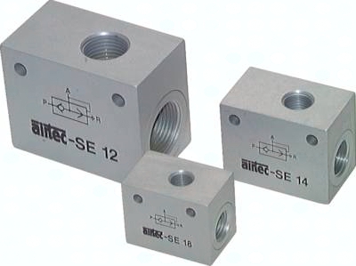 Präzisionsausführung: Werkstoffe: Körper: Aluminium eloxiert, Dichtungen: NBR Temperaturbereich: -10°C bis max. +70°C Betriebsdruck: 0,5 bis 10 bar Medien: geölte und ungeölte, gefilterte Druckluft Standardausführung: Werkstoffe: Körper: Messing vernickelt, Dichtungen: NBR / Polyurethan; Temperaturbereich: -20°C bis max. +70°C Betriebsdruck: 1 bis 10 bar Medien: geölte und ungeölte, gefilterte Druckluft Optional: Viton-Dichtung (-20°C bis max. +150°C) -V Funktion: Diese Ventile werden verwendet, um Zylinder sehr schnell zu entlüften und damit die Zylindergeschwindigkeit zu erhöhen. Sie werden dazu mit dem Anschluss A direkt an den Zylinder geschraubt. Belüftung: Die von dem Steuerventil strömende Luft kann von Anschluss P ungehindert zu Anschluss A strömen. Entlüftung: Wenn das Steuerventil auf Entlüftung schaltet, wird P drucklos. Das Ventil schaltet auf Durchfluss von A nach R und die Luft aus dem Zylinder kann ungehindert ins Freie entlüften. Achtung: Nur bei Zylindern anwenden, bei denen für eine ausreichende Dämpfung in den Endlagen gesorgt ist (einstellbare Entlagendämpfung, Stoßdämpfer). Bei Verwendung eines Schalldämpfers in Anschluss R muss dieser groß genug dimensioniert sein, um Staudruck zu vermeiden. (Wir empfehlen unsere Schalldämpfer Typ KU)
