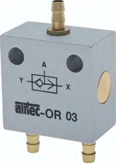 Werkstoffe: Körper: Aluminium eloxiert, Innenteile: Messing und Stahl rostfrei (Standardausführung: Messing und Kunststoff), Dichtungen: NBR Temperaturbereich: -10°C bis max. +70°C (Standardausführung: max. +60°C) Medien: geölte und ungeölte, gefilterte Druckluft Betriebsdruck: -0,95 - 10 bar (Standardausführung: 2 - 10 bar) Funktion: Am Ausgang A erscheint ein Signal, wenn am Eingang X oder Y ein Signal ansteht. Wenn an beiden Eingängen Signale anstehen, so kommt der höhere Druck zum Ausgang A. Das ODER-Glied hat als passives Element keine eigene Entlüftung. Nach Löschen beider Eingangssignale wird über die vorgeschalteten Signalglieder entlüftet.