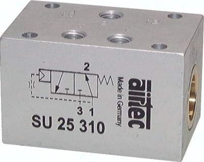 Werkstoffe: Körper: Aluminium eloxiert, Innenteile: Aluminium und Stahl rostfrei (Standardausführung: Messing). Dichtungen: Kunststoff und NBR Temperaturbereich: -10°C bis max. +70°C (Standardausführung: -10°C bis max. +60°C) Medien: geölte und ungeölte Druckluft Funktion: Dieses Ventil unterbricht ein Dauersignal, sodass durch ein Dauersignal am Eingangsanschluss 1 nur ein kurzer Impuls am Ausgang 2 entsteht. Ein bei 1 ankommendes Signal hat Durchfluss zum Ausgang 2. Nach dem Impuls schaltet der im Ventil entstehende Druck den Kolben um. Anschluss 1 wird gesperrt, Ausgang 2 entlüftet nach 3.