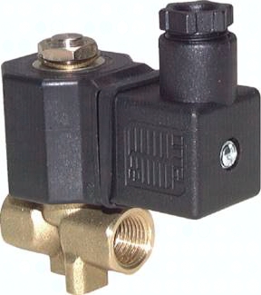Werkstoffe: Körper: Messing, Innenteile: Messing / Edelstahl, Dichtung: NBR (Typen mit G 1/8" und G 1/4": Viton) Temperaturbereich: -10°C bis max. +85°C (Typen mit G 1/8" und G 1/4": -10°C bis max. +130°C), Umgebung: -10°C bis max. +50°C Medien: Druckluft, neutrale Gase, Wasser, neutrale dünnflüssige Medien, Heizöl, andere Medien auf Anfrage Einbaulage: mit stehendem Magneten Spannungen: Standard: 24 V=, 230 V AC, auf Wunsch: 12 V=, 48 V=, 24 V AC, 115 V AC, 48 V AC Schutzart: IP 65 Optional: Viton-Dichtung (-10°C bis max. +130°C) -V, EPDM-Dichtung für Luft und Heißwasser (-10°C bis max. +120°C) -EP, EX-geschützt** -EX Information: Diese Ventile werden grundsätzlich mit Spule und Stecker ausgeliefert! Achtung: Servogesteuerte Ventile benötigen zum Öffnen oder Schließen eine Druckdifferenz zwischen Ventileingang und -ausgang. Die Druckdifferenz wird als Mindestdruck angegeben. Entsteht im Ventil ein Druckausgleich, eventuell dadurch, dass am Ventilausgang kein oder nur wenig Medium verbraucht wird, funktioniert das Ventil nicht mehr (es öffnet oder schließt nicht zuverlässig). *Wasserdurchfluss bei +20°C, 1 bar Druck am Ventileingang, freier Auslauf. Durchfluss für Luft [l/min] ca. 13,4 x kv x PEingang, wenn PAusgang < PEingang/2 (PEingang und PAusgang sind Absolutwerte in bar.), **bitte Schutzart angeben, nur NC-Ventile