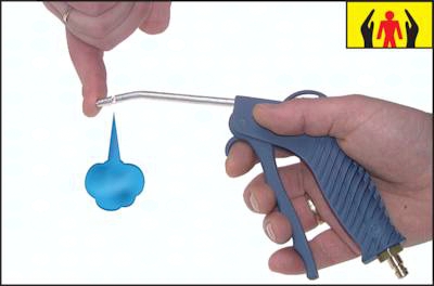 Vorteile: warmes Griffgefühl durch Kunststoffkörper, geringes Gewicht, Ausblasluftmenge mittels Betätigungshebel dosierbar, Verwendung auch für feine Ausblastätigkeiten, z.B. Feinmechanik oder Kunststoffindustrie, sobald der Abstand zwischen Düse und Fläche zu gering wird, entweicht die Luft seitlich *Standardkupplung