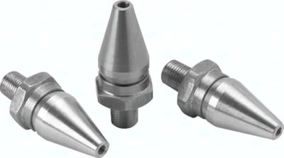 Funktion: Durch einen dünnen einstellbaren Ringspalt entweicht Luft mit nahezu Schallgeschwindigkeit. Dabei wird Umgebungsluft mitgerissen, sodass ein Luftstrahl entsteht, der aus ca. dem 25-fachen des eingesetzten Luftvolumen besteht. Geräuschpegel und Luftverbrauch sind dabei um ein Vielfaches geringer als bei nach dem Venturiprinzip arbeitenden Düsen gleicher Leistung. Der Ringspalt kann stufenlos vom geschlossenen Zustand bis zu 0,25 mm je nach Anwendungsfall eingestellt werden. Durch die Konstruktion ist ein Blockieren des Luftstrahls und die damit verbundene Verletzungsgefahr nicht möglich. Verwendung: Luftspardüsen werden dort eingesetzt, wo mit einem minimalen Druckluftverbrauch große Luftmengen bei niedrigem Geräuschpegel zum Abblasen benötigt werden. Sie lassen sich hervorragend für die Kühlung oder das Ausstoßen von Teilen wie auch für einfache Blaspistolen verwenden. Sie können universell als Einfachdüsen oder in Mehrfachdüsenanlagen für Förderbänder oder Transferstraßen eingesetzt werden. Bei geringem Luftverbrauch wird bei nahezu jedem Einsatzfall eine bis zu 70%ige Energiekostenreduzierung erreicht, wodurch sich die Investition schon nach kurzer Zeit amortisiert. Anwendungsbeispiele: Auswurf von Teilen aus Spritzgussmaschinen, Entfernen von Spänen, Schneideabfällen oder Schleifstaub, Reinigung von Teilen vor dem Lackieren, Kühlen und Säubern von Gussteilen, Kühlen und Säubern von Transportbändern und den darauf befindlichen Teilen Vorteile: geringer Luftverbrauch - energiesparend (bis zu 70% Kostenersparnis), niedrige Anschaffungs- und Betriebskosten, wartungsfrei, keine beweglichen Bauteile - kein Verschleiß, niedriger Geräuschpegel, Luftstrahl kann nicht blockiert werden (Arbeitsschutz), universell einstellbarer Luftstrahl Achtung: Verwenden Sie für das Einschrauben in BLP 14: RN M12x1,25-14 MS / RN M12x1,25-18 MS.