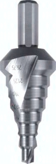 Beschreibung: Leistungsstarker, rechtsschneidender Blechschälbohrer / Stufenbohrer mit scharfer Bohrerspitze (Kreuzanschliff nach DIN 1412C) zum Bohren von Löchern in Bleche bis 4 mm Stärke. Durch die scharfe Bohrerspitze ist es möglich, ohne Vorbohren auch in dünnwandige Materialien zu bohren. Die tiefgeschliffene Spannut (bei Stufenbohrern spiralgenutet) gewährleistet absolute Laufruhe und hohe Schnittleistung. Bei dem Stufenbohrer kann die jeweils nächsthöhere Stufe zum Entgraten der Bohrung verwendet werden. Qualität: HSS-CBN geschliffen Verwendung für Stahl, Stahlguss legiert und unlegiert, Grau-, Temper-, Sphäro- und Druckguss, Sintereisen, Neusilber, Graphit, kurzspanende Aluminiumlegierungen, Messing, Bronze und Kunststoffe