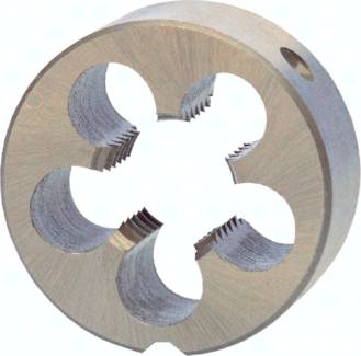 Beschreibung: Schneideisen, Form B, vorgeschlitzt, geschlossen für metrische Gewinde nach DIN ISO 13. Toleranz nach ISO 6g. Qualität: HSS HSS - Verwendung für Stahl, Stahlguss legiert und unlegiert (<800 N/mm² Zugfestigkeit), Grau-, Temper-, Sphäro- und Druckguss, Sintereisen, Neusilber, Graphit, kurzspanende Aluminiumlegierungen, Messing und Bronze.