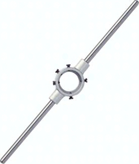 Beschreibung: Gehäuse aus Zinkdruckguss. Zur Aufnahme geschlossener und geschlitzter Schneideisen nach DIN EN 22568 (ehem. DIN 223) und DIN EN 24231 (ehem. DIN 5158). Griffe aus Stahl, ein Griff ist demontierbar.