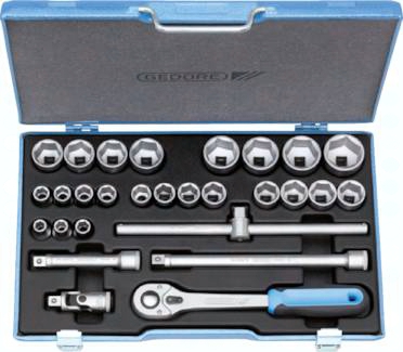 Ausführung: Steckschlüsselsätze mit Innenvierkantantrieb nach DIN 3120-C 12.5, ISO 1174 mit Kugelarretierung, Vanadium-Stahl, verchromt