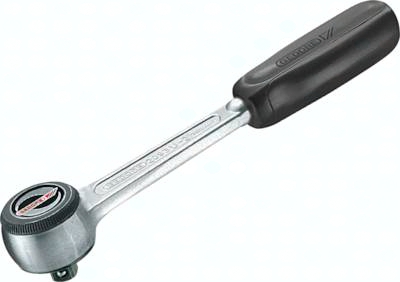 Ausführung: Knarren nach DIN 3122, ISO 3315 für Steckschlüsseleinsätze und Verbindungsteile mit Innenvierkantantrieb nach DIN 3120-C6.3, ISO 1174 mit Kugelarretierung, Vanadium-Stahl, verchromt