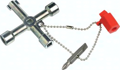 Ausführung: Glanzverzinkter Schaltschrankschlüssel aus Zinkdruckguss für alle gängigen Schaltschrankschließungen und Absperrsysteme in der Haustechnik. Jeder Schaltschrankschlüssel wird mit Bitadapter und Wendebit (Kreuzschlitz PH2, Schlitz 1 x 7 mm), sowie Befestigungskette geliefert.