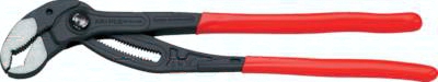 Beschreibung: Bauform "Alligator": Wasserpumpenzange mit durchgestrecktem Gelenk für hohe Stabilität. Selbstklemmend an Rohren und Muttern: kein Abrutschen. Ein Klemmschutz verhindert Quetschverletzungen. Die spezialgehärteten Zähne (ca. 61 HRC) gewährleisten eine hohe Verschleißfestigkeit. Bauform: "Cobra": Wasserpumpenzange mit durchgestrecktem Gelenk für hohe Stabilität. Selbstklemmend an Rohren und Muttern: kein Abrutschen. Ein Klemmschutz verhindert Quetschverletzungen. Die spezialgehärteten Zähne (ca. 61 HRC) gewährleisten eine hohe Verschleißfestigkeit. Einstellung schnell und einfach per Knopfdruck direkt am Werkstück. Die Feinverstellung ermöglicht eine optimale Anpassung an verschiedene Werkstückgrößen. *größere Greifkapazität und geringeres Gewicht als vergleichbare Rohrzangen