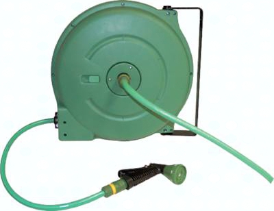 Funktion: Der Schlauch kann ausgezogen und bei jeder Umdrehung der Trommel mehrfach arretiert werden. Nach kurzem Anziehen rollt die Trommel den gesamten Schlauch wieder auf. Werkstoffe: Körper und Trommel: Kunststoff, Befestigungsbügel: Stahl schwarz lackiert, Schlauch: Polyether-Polyurethan (für Wasser: PVC) Lieferumfang: automatischer Schlauchaufroller mit Schlauch, Stopper und Gewindetüllen an den Schlauchenden, Befestigungsbügel *nur für Wasser