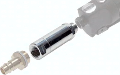 Beschreibung: Die Inline-Druckregler werden direkt in das Werkzeug eingeschraubt, um den Arbeitsdruck auf den für das Werkzeug optimalen Druck herunterzuregeln. Die Druckregler zeichnen sich durch geringes Gewicht (ca. 40 g), hohe Durchflussleistung (bis 800 l/min*) und durch eine automatische Sekundärentlüftung aus. Werkstoffe: Gehäuse: Aluminium, Dichtung: NBR Temperaturbereich: 0°C bis max. +80°C Eingangsdruck: max. 25 bar Verwendung: nur für Druckluft Vorteile: Ein von der Druckleitung entkuppeltes Druckluftgerät wird im Gegensatz zu Blaspistolen-Druckreduzierventilen sofort vollständig entlüftet. Ein Verletzungsrisiko durch unbeabsichtigtes Auslösen von z.B. abgekuppelten, scheinbar drucklosen Druckluftnaglern ist ausgeschlossen. der eingestellte Druck kann nicht manipuliert werden *bei 12 bar Eingangsdruck, p = 0,5 bar