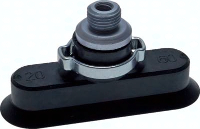Werkstoff CR: Bezeichnung: Chloropren; Temperaturbereich: -40°C bis max. +110°C; Verschleißfestigkeit*: 3; Ölbeständigkeit*: 2; Wetter- und Ozonbeständigkeit*: 2; Benzinbeständigkeit*: x; Vorteil: witterungsbeständig; Empfehlung für: Universaleinsatz Werktstoff NBR: Bezeichnung: Nitril-Kautschuk; Temperaturbereich: -30°C bis max. +90°C; Verschleißfestigkeit*: 3; Ölbeständigkeit*: 1; Wetter- und Ozonbeständigkeit*: x; Benzinbeständigkeit*: 3; Vorteil: ölbeständig, wasserbeständig bis max. 70°C; Empfehlung für: Universaleinsatz Werkstoff SI: Bezeichnung: Silikon-Kautschuk; Temperaturbereich: -40°C bis max. +200°C; Verschleißfestigkeit*: x; Ölbeständigkeit*: x; Wetter- und Ozonbeständigkeit*: 1; Benzinbeständigkeit*: x; Vorteil: temperaturbeständig, sehr flexibel; Empfehlung für: Nahrungsmittel, Elektronik Werkstoff PUR: Bezeichnung: Polyurethan; Temperaturbereich: -20°C bis max. +80°C; Verschleißfestigkeit*: 2; Ölbeständigkeit*: 1; Wetter- und Ozonbeständigkeit*: 3; Benzinbeständigkeit*: 2; Vorteil: hohe Standzeit; Empfehlung für: rauhe Einsatzbedingungen, Automobil Werkstoff NR: Bezeichnung: Natur-Kautschuk; Temperaturbereich: -40°C bis max. +80°C; Verschleißfestigkeit*: 2; Ölbeständigkeit*: x; Wetter- und Ozonbeständigkeit*: x; Benzinbeständigkeit*: x; Vorteil: flexibel, abriebfest; Empfehlung für: Holz, unebenene Oberflächen Werkstoff NRE: Bezeichnung: Natur-Kautschuk; Temperaturbereich: -40°C bis max. +80°C; Verschleißfestigkeit*: 2; Ölbeständigkeit*: x; Wetter- und Ozonbeständigkeit*: x; Benzinbeständigkeit*: x; Vorteil: sehr flexibel, abriebfest; Empfehlung für: Holz, unebene Oberflächen Werkstoff SBR: Bezeichnung: Styrol-Butadien-Kautschuk; Temperaturbereich: -30°C bis max. +80°C; Verschleißfestigkeit*: 1; Ölbeständigkeit*: x; Wetter- und Ozonbeständigkeit*: 3; Benzinbeständigkeit*: 3; Vorteil: abdruckarm, sehr flexibel, sehr abriebfest; Empfehlung für: Holz, unebene Oberflächen alle Materialien 45-55 Shore A (soweit nicht anders angegeben) *1 = sehr gut; 2 = gut; 3 = ausreichend; x = nicht empfohlen Lieferumfang: 1 Stk. Sauger mit Ohrschelle zur Fixierung auf Halter (Halter muss separat bestellt werden) *wird mit Aluverstärkung geliefert, **Außengewinde G 1/8" und G 1/4" zzgl. 4 mm, ***schwarz, ****rot, *****beige/braun